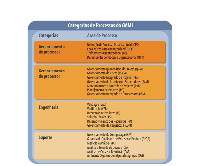 Estruturado em 5 níveis de maturidade, o CMMI abrange 25 áreas de processo divididas em 4 categorias: • Gerenciamento de projetos; • Gerenciamento de processos; • Engenharia; • Suporte.