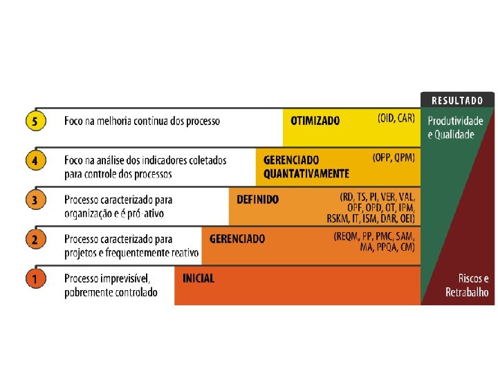 Níveis de Capacidade • Nível 5: Em otimização (ou otimizado) (abolido no CMMI 1. 3) • é um processo gerenciado quantitativamente (nível de capacidade 4) e melhorado com base no entendimento das causas comuns de variação inerentes ao processo.