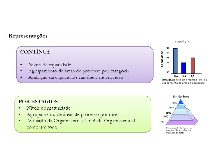 Representações • A abordagem por estágios, por sua vez, serve para classificar a empresa em um determinado nível de maturidade, em número de cinco. • Para alcançar determinado nível de maturidade, a empresa deverá realizar um determinado conjunto de áreas de processos pré-selecionados.
