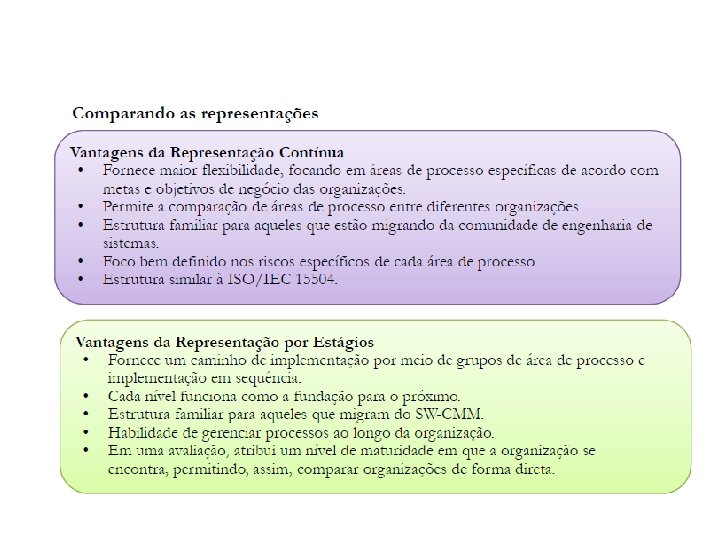 Representações • Uma das principais características do CMMI é permitir à organização que o adota a escolha entre as duas formas distintas de representação. • A abordagem contínua permite à empresa escolher as áreas de processos para as quais deseja ser avaliada, conferindo-lhe liberdade para aperfeiçoar os seus processos na ordem que mais lhe for conveniente, seja para atender aos objetivos de negócio, seja para a redução dos riscos da organização.