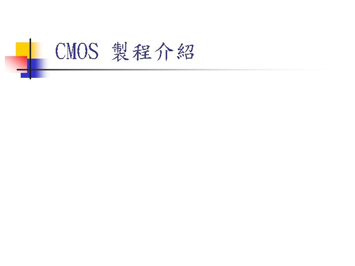 CMOS 製程介紹 n IC built on silicon substrate : n n n some structures diffused into substrate. other structures built on top of substrate. Substrate regions are doped with n-type and p-type impurities. (n+ = heavily doped) Wires made of polycrystalline silicon (poly), multiple layers of aluminum (metal). Insulator - Silicon Dioxide (Si. O 2) n n n Used to insulate transistor gates (thin oxide) Used to insulate layers of wires (field oxide) Can be grown on Silicon or Chemically Deposited