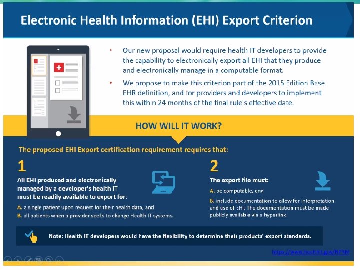 ONC: Information Blocking Provisions q Defines key terms, including Electronic Health Information (EHI) • EHI, in addition to patient personal and clinical data, includes data related to eligibility, benefits, billing information, and payment information q Provides examples of practices likely to interfere with access, exchange, or use of EHI • Restrictions on access, exchange, or use of EHI • Disabling interoperability capabilities of Health IT • Impeding interoperability innovations and advancement • Rent-seeking and other opportunistic pricing practices • Non-standard implementation practices q Codifies compliance with information blocking provisions as a Condition of Certification q Introduces 7 exceptions to the general prohibition on information blocking (next slides) q Requests for information 14 3/20/2017 • Disincentives for health care providers • Including pricing transparency as EHI in future • Clinical Ancillary Services & System / Care Delivery Technology Services 2017 © All TEFCA certification criteria Rights Reserved.
