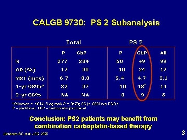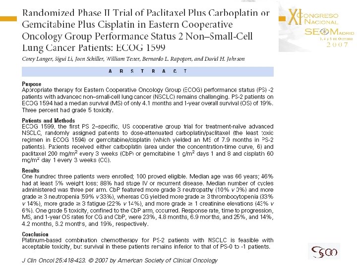 GEPC/98 -02: PS Arm CG CGV GV IV OR(%) 43 38 26* PS 0 -1 9. 11 TTP (wk) 25 21 22 PS 2 4. 79 MST (m) 8. 7 7. 9 8. 1 ST IIIB 9. 4 1 y OS (%) 35 31 35 ST IV 8. 1 *CG Subgroups (MST) v GV IV (p=0. 0003); CGV v GV IV (p=0. 01) Alberola et al, JCO 2003
