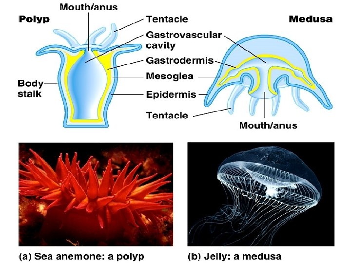 Two Main Body Plans of Cnidarians UPRIGHT TENTACLES HANG DOWN epidermis Polyp mouth mesoglea gastrodermis Medusa Mesoglea THICK Mesoglea THIN