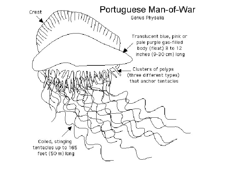 Portuguese man-of-war • Colonial Hydrozoan (not a single organism • Tentacles sting prey such as fish & humans • Polyps in colony feed • Has gas-filled air float