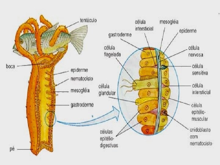 HIDRA Água doce; 10 a 30 milímetros; Cavidade gastrovascular; Camada celular: epiderme (externa), gastroderme (revestimento interno) Epitélio-muscular = movimento; Células nervosas; mesoglia-camada gelatinosa