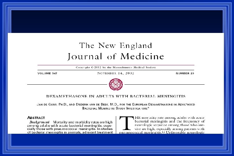 Role of Steroids l The addition of anti-inflammatory agents has been attempted as an adjuvant in the treatment of meningitis l Early administration of corticosteroids for pediatric meningitis has shown no survival advantage, but there is a reduction in the incidence of severe neurologic complications and deafness l Less bilateral deafness late neurological sequelae in controls compared to children treated with steroids