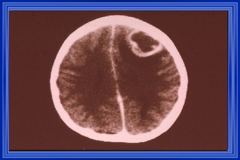 BRAIN ABSCESS l l l l Infrequent but not uncommon; pathogenesis diverse with contiguous spread & blood-borne seeding most common Clinical features include HA (90%), fever (57%), MS changes (67%), hemiparesis (61%), & papilledema (56%) Dx often suggested by neuroimaging (CT or MRI) LP is contraindicated due to risk of herniation Infxns often polymicrobial (strep, enteric GNRs, &/or anaerobes); S. aureus may cause abscesses in association with IE Other less common etiologies include Nocardia, fungi, M. tuberculosis, T. gondii, & neurocysticercosis Drainage often a necessary component of management
