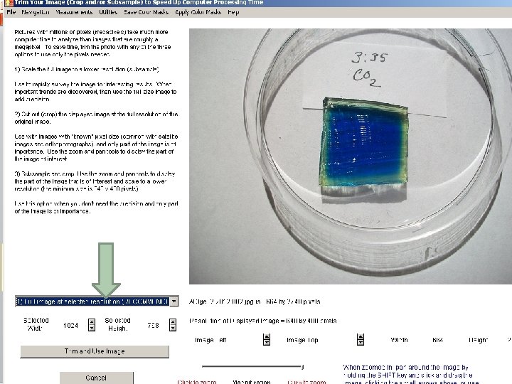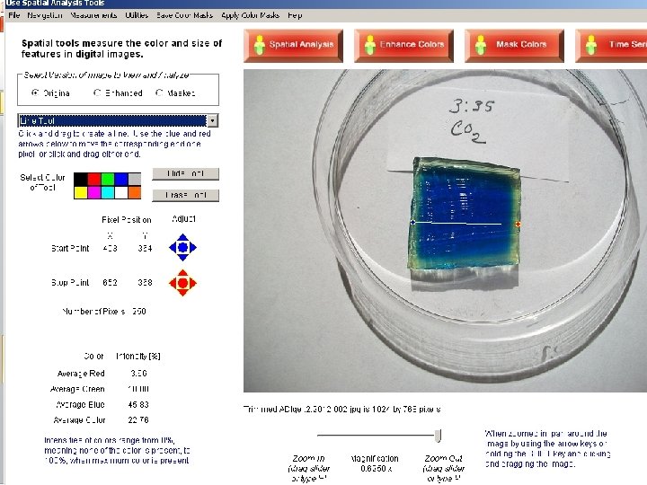 Conducting the Experiment/Gathering and Analyzing Data 1. Set up the experiment according to the directions on the lab directions handout. 2. Photograph the control at the beginning, then a sample of each cube exposed to CO 2 over time (1 hour, 6 hours). 3. Use the ADI line tool, R, G, B values and graph colors option (SPACIAL ANALYSIS ) to analyze data both qualitatively and quantitatively.