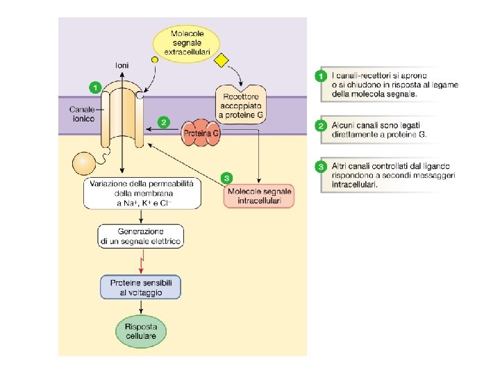 Trasduzione mediata da modificazione del potenziale di membrana I segnali elettrici sono utilizzati dalla cellula per condurre informazioni rapidamente e a lunga distanza che spesso sono “tradotte” in un luogo della cellula lontano dalla loro insorgenza. La genesi e la conduzione di questi messaggi dipendono dalla variazione della differenza di potenziale esistente ai capi della plasma membrana. Queste variazioni dipendono dal flusso di correnti (IONICHE) attraverso la membrana stessa.