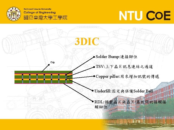 2. 5 DIC 在晶片與基板之間加入Si interposer,藉由Si interposer整合晶 片並當作晶片與基板的連接橋梁。 ubump Underfill TSV Solder Ball PCB Substrate
