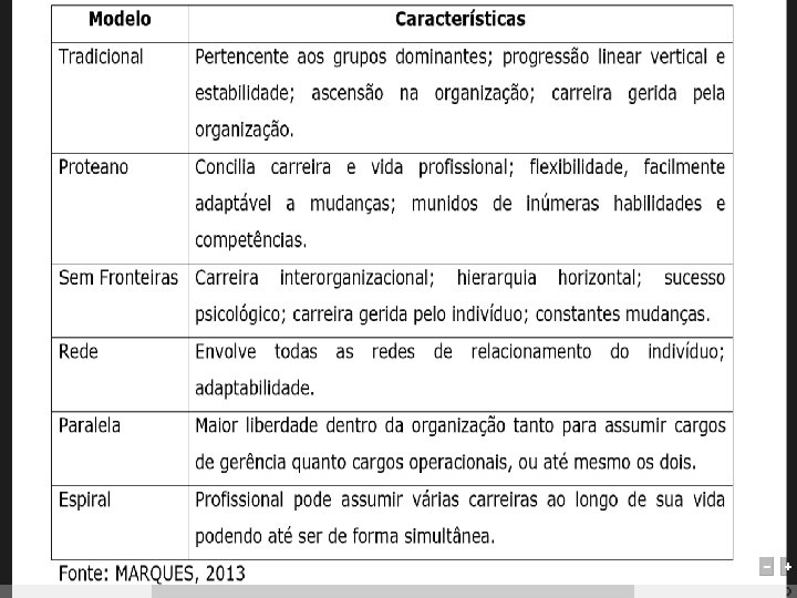 NCORAS DE CARREIRA • A auto-percepção de habilidades, necessidades e valoras, forma o que se chama de ncoras de carreira (Schein, 1978; 1990), e são elementos da realidade do indivíduo que irão determinar as suas preferências pode determinada ocupação, carreira, empresa ou oportunidade. Segundo Schein (1978, 1990), a auto-percepção leva à construção de padrões de escolhas de carreira, que podem ser agrupados na seguintes categorias: • Competência gerencial • Competência técnica ou funcional • Segurança e estabilidade • Criatividade • Autonomia e independência • Senso de serviço e dedicação à causa • Desafio constante • Estilo de vida integrado