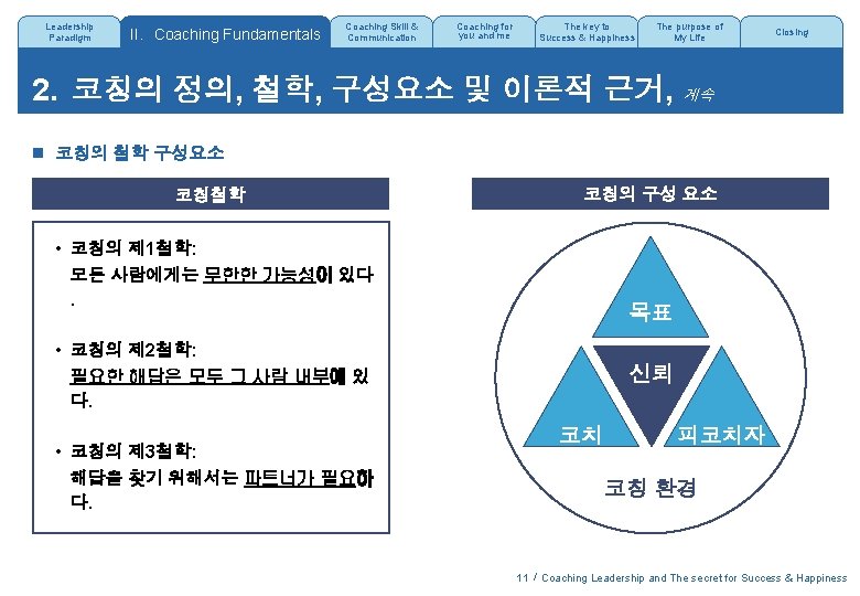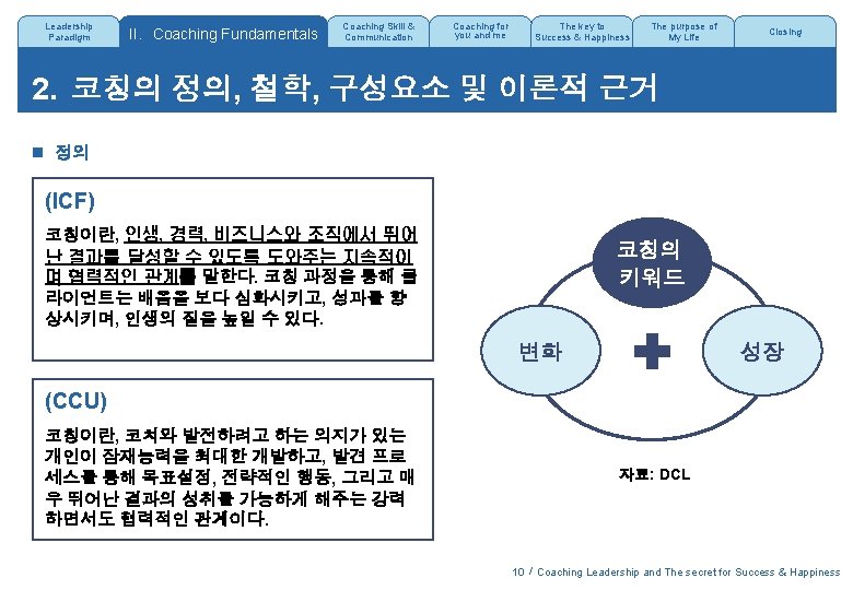 Leadership Paradigm II. Coaching Fundamentals Coaching Skill & Communication Coaching for you and me The key to Success & Happiness The purpose of My Life Closing 1. 코칭의 역사 n 1990년대 – “비즈니스 코치” • Corporate Coaching University(1992) • International Coach Federation(1994) n Coach의 어원 – “ 4마리의 말이 끄는 마차” n 1880년대 – “스포츠 코치” • The Inner game of Tennis Timothy Callwey , 1975 • Coaching for performance, John Whitmore(1995) n 2000년대 –국내도입 • 한국코칭협회 설립(2003, 12) 자료: DCL 9 Coaching Leadership and The secret for Success & Happiness