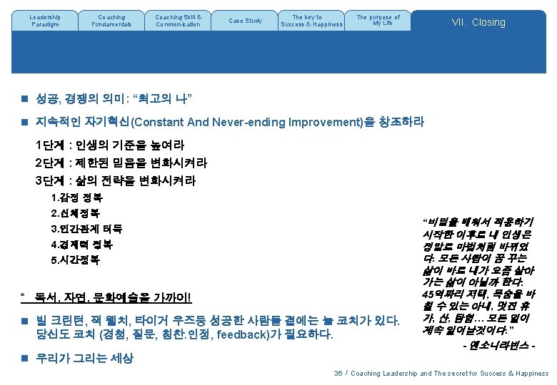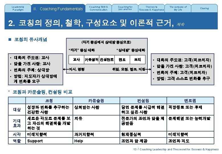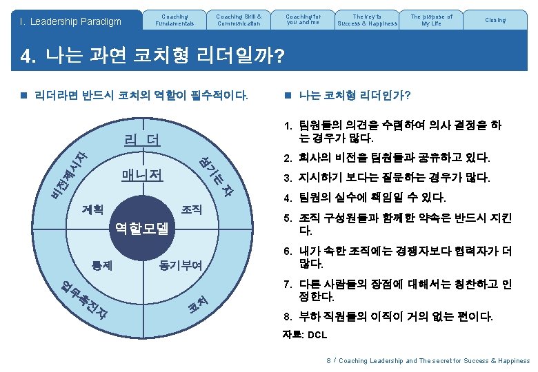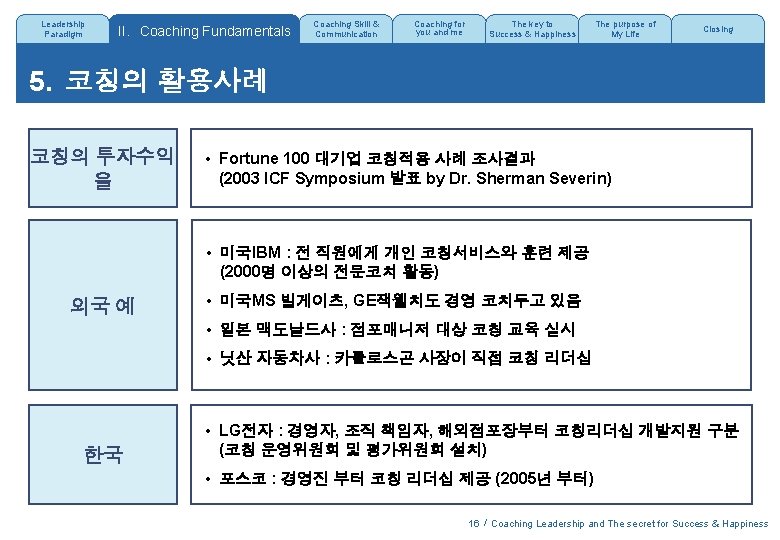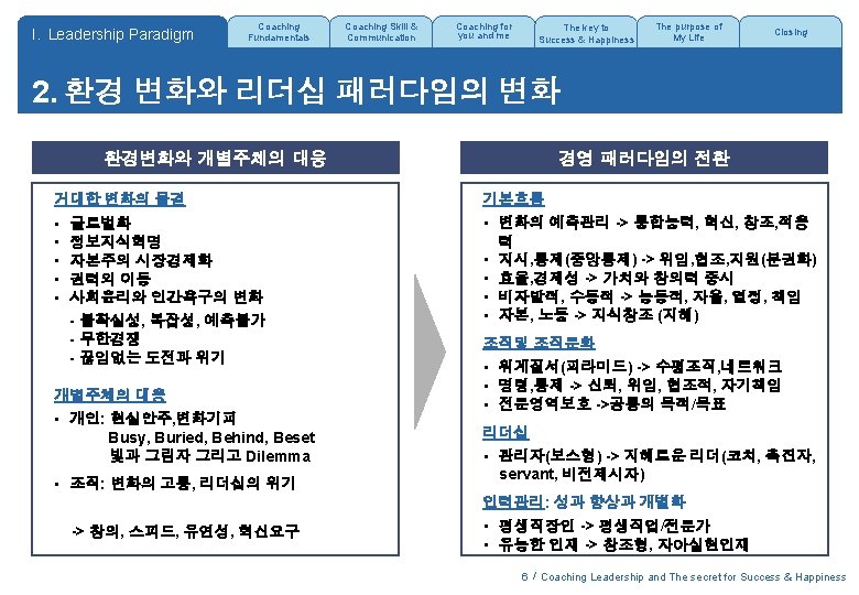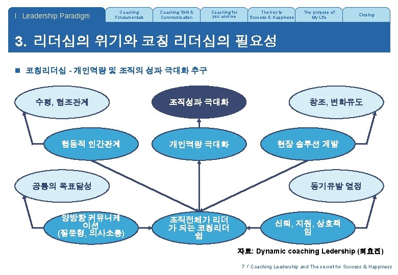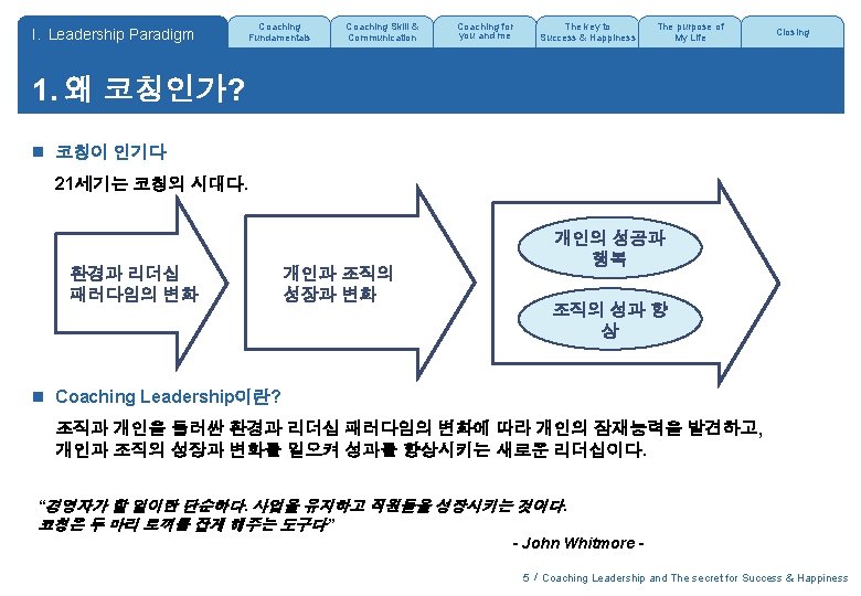 Contents I. Leadership Paradigm III. Coaching Skill & Communication 1. 왜 코칭인가? 2. 환경 변화와 리더십 패러다임의 변화 3. 리더십의 위기와 코칭 리더십의 필요성 IV. Coaching for you and me 4. 나는 과연 코치형 리더일까? II. Coaching Fundamentals V. The Key to Success & Happiness 1. 코칭의 역사 2. 코칭 이란? 코칭의 특성 VI. The purpose of My Life 3. 코칭의 대상과 종류 4. 코칭이 효과와 한계 5. 코칭의 활용사례 VII. Closing Sources: 1. Dynamic Coaching Leadership (최효진) 4. The Coaching Bible (Lan Mcdermott) 2. Coaching for Performance (John Whitmore) 5. Exploring win-win Partnership (이희경) 3. The Heart of coaching (Thomas Crane) 6. Awaken the Giant within (Anthony Robbins) 4