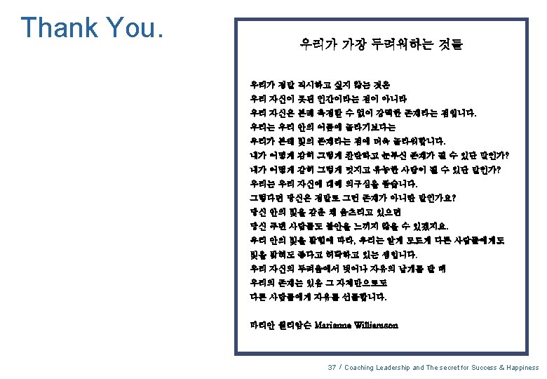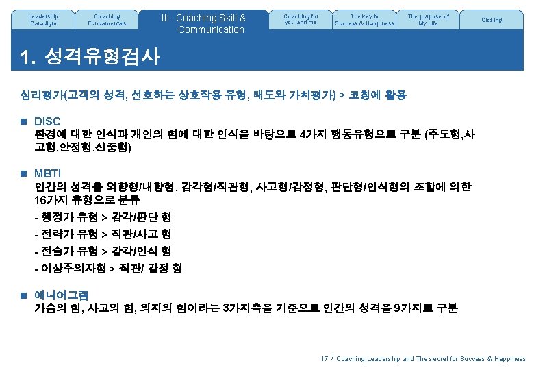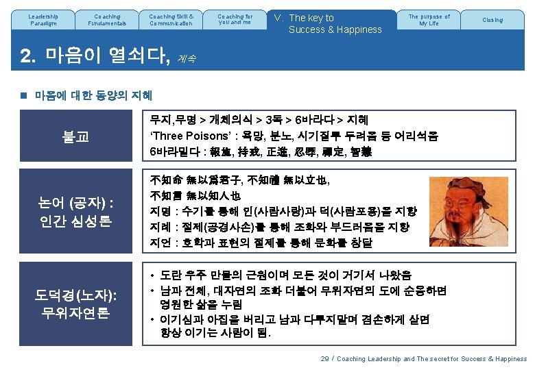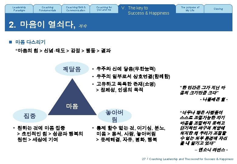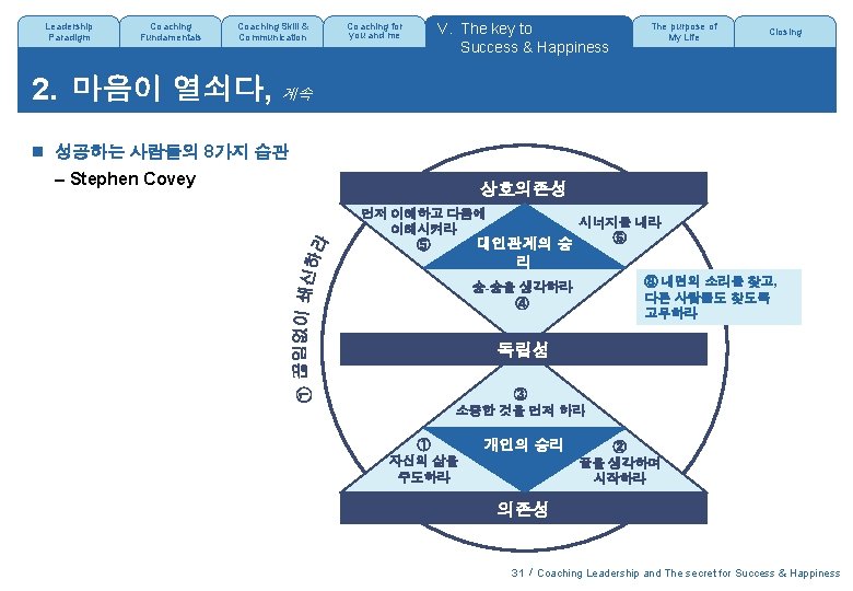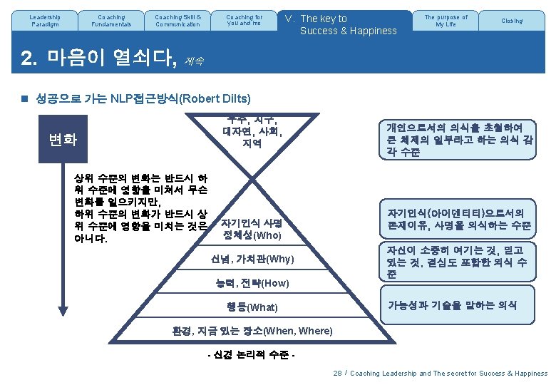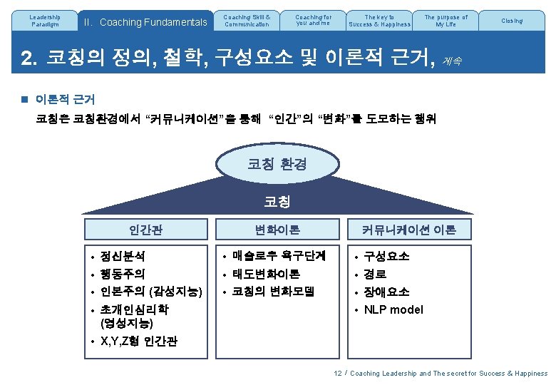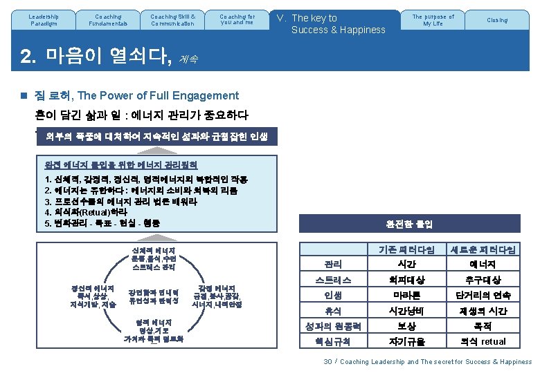 Contents I. Leadership Paradigm III. Coaching Skill & Communication 1. 왜 코칭인가? 2. 환경 변화와 리더십 패러다임의 변화 3. 리더십의 위기와 코칭 리더십의 필요성 IV. Coaching for you and me 4. 나는 과연 코치형 리더일까? II. Coaching Fundamentals V. The Key to Success & Happiness 1. 코칭의 역사 2. 코칭 이란? 코칭의 특성 VI. The purpose of My Life 3. 코칭의 대상과 종류 4. 코칭이 효과와 한계 5. 코칭의 활용사례 VII. Closing Sources: 1. Dynamic Coaching Leadership (최효진) 4. The Coaching Bible (Lan Mcdermott) 2. Coaching for Performance (John Whitmore) 5. Exploring win-win Partnership (이희경) 3. The Heart of coaching (Thomas Crane) 6. Awaken the Giant within (Anthony Robbins) 4