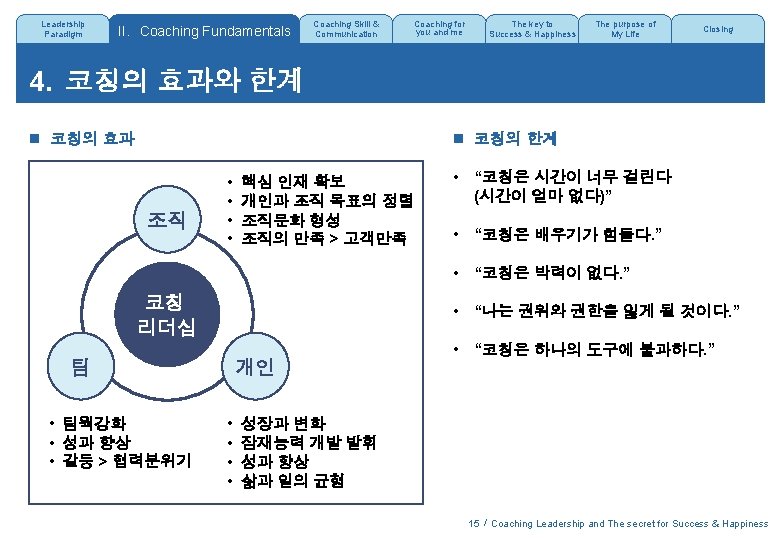 Leadership Paradigm II. Coaching Fundamentals Coaching Skill & Communication Coaching for you and me The key to Success & Happiness The purpose of My Life Closing 3. 코칭의 대상과 종류 • 인생의 가치목표, 비전발견 라이프 코칭 (Life Coaching) • 삶의 균형 • 삶의 장애물 제거 • 영적성장등 • 직업선택(이직, 전직등) 커리어 코칭 (Career Coaching) • 경력설계와 전략수립 • 성공적인 직장 생활 스킬 향상 • 대인관계 비즈니스 코칭 (Business Coaching) 기타 대상에 따라서 • 조직의 성과 향상 • 팀웍 • 리더십강화 • 조직문화 • 커뮤니케이션스킬 • Executive Coaching, Children Coaching, Young People Coaching, Christian Coaching, Leader Coaching 등 14 Coaching Leadership and The secret for Success & Happiness