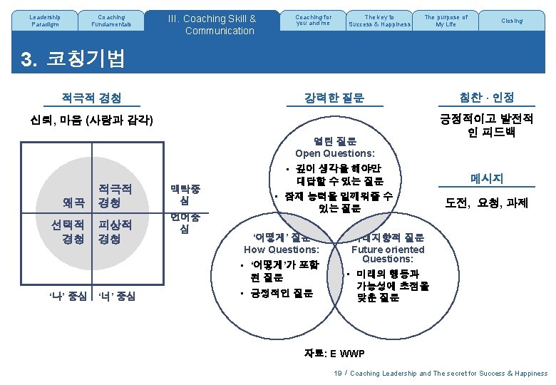 Leadership Paradigm Coaching Fundamentals Coaching for you and me III. Coaching Skill & Communication The key to Success & Happiness The purpose of My Life Closing 2. 코칭대화 모델, 계속 n 5단계 모델 목표(goal) 코칭대화모델 자원(Resources) 1단계 2단계 3단계 4단계 포커스 설정 가능성 발견 실행계획 수립 장애요소 제거 현 행동(Action) 5단계 목 마무리 갭을 좁히기 위한 코칭 코칭스킬 재 자료: DCL • 맥락적 경청(Contextual Listening) ® • 발견질문(Discovery Questioning) ® • 메시징(Messaging) • 인정(Acknowledging) 표 기초 (fundamental) 18 Coaching Leadership and The secret for Success & Happiness