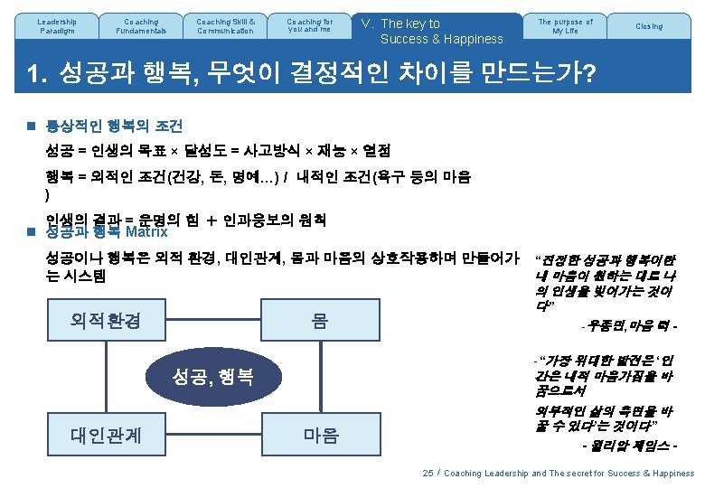Leadership Paradigm Coaching Fundamentals Coaching Skill & Communication IV. Coaching for you and me The key to Success & Happiness The purpose of My Life Closing 2. 코칭과 나 n 코칭 동기 n ICF 코칭 자격취득 (2008. 2. 15) n 코칭의 이점 n 코칭 사례 - 가족 - 업무 활용 사례 - 남을 도운 사례 24 Coaching Leadership and The secret for Success & Happiness