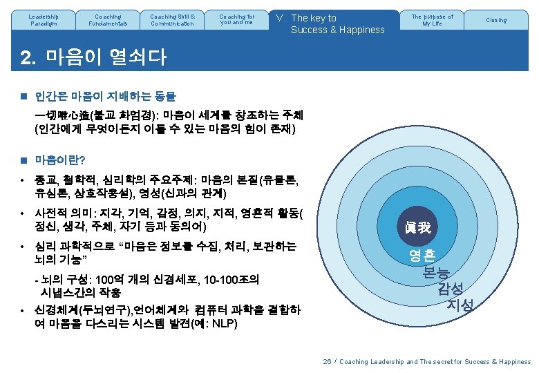 Leadership Paradigm Coaching Fundamentals Coaching Skill & Communication IV. Coaching for you and me The key to Success & Happiness The purpose of My Life Closing 1. Coaching for you n 당신의 인생 수레바퀴는 어떤 모습인가? n 직장에서의 모습은 어떠한가? 삶의 기본요소 : 성취, 균형, 과정(Gremlin) 환경/ 여건 직업/일/ 경력 인생의 목적/ 가치 자기개발 /여유 가족 인간관계 자기계발/ 성장 건강 의사소 통 위험 감수 팀 성장 고객 서비 스 경제력 23 성과 변화에 대처 하기 전략적 기획 Coaching Leadership and The secret for Success & Happiness