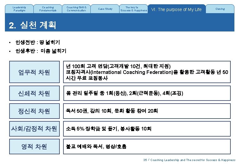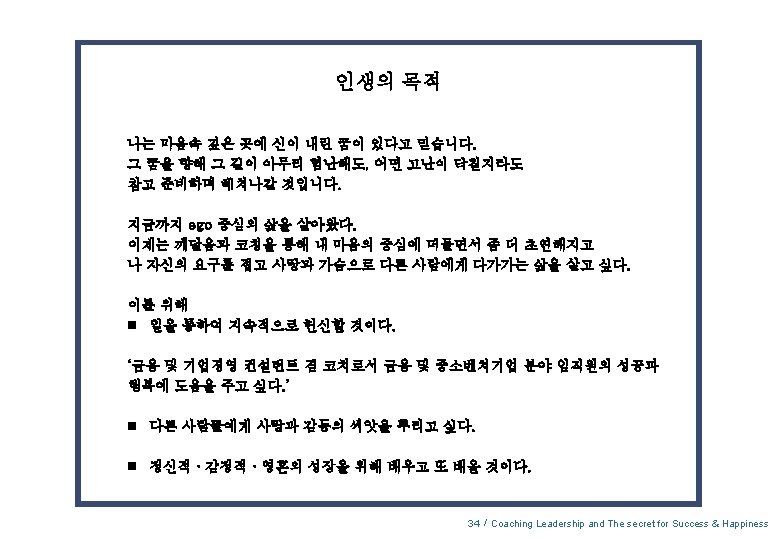 Leadership Paradigm Coaching Fundamentals Coaching Skill & Communication Coaching for you and me The key to Success & Happiness VI. The purpose of My Life Closing 1. 나의 삶의 모습 n 인생의 수레바퀴 환경/ 여건 직업/일/ 경력 인생의 목적/ 가치 가족 인간관계 건강 “스스로 인생계획을 짜지 자기계발/ 성장 않으면 다른 사람이 우리 인생을 지배할 것이 다. ” - 앤소니 라빈스 - 경제력 33 Coaching Leadership and The secret for Success & Happiness