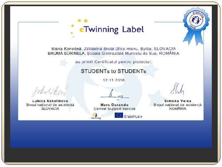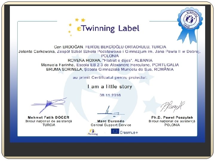 “I am a little story“ “Students to students” Parteneriate cu țări ca TURCIA, POLONIA, ALBANIA, PORTUGALIA și SLOVACIA în cadrul cărora unitatea a primit Certificat e. Twinning Label