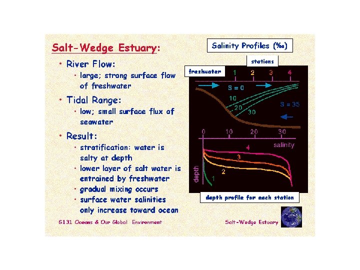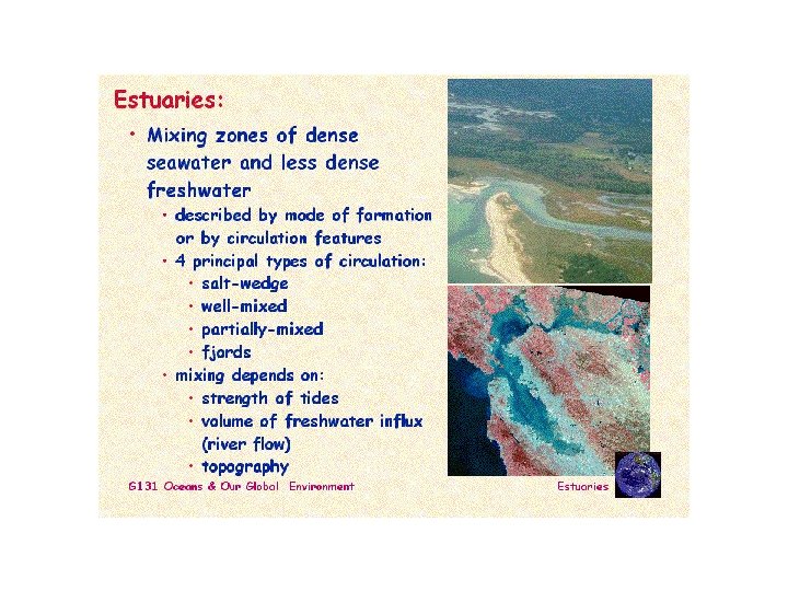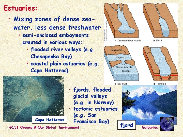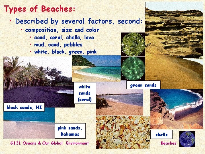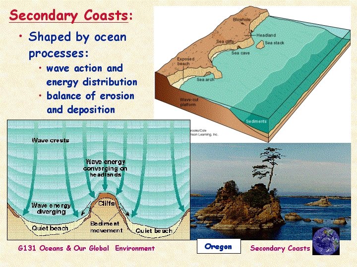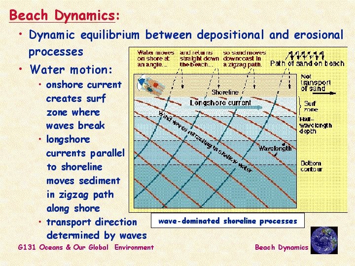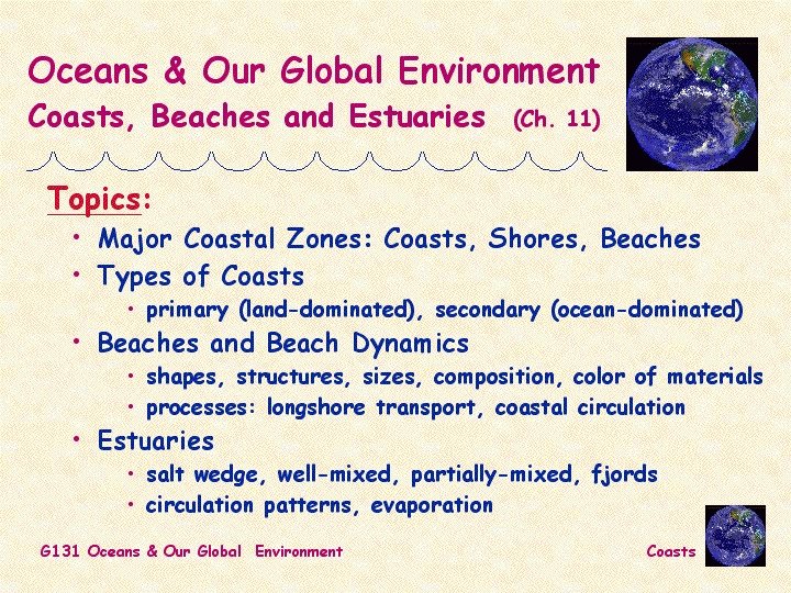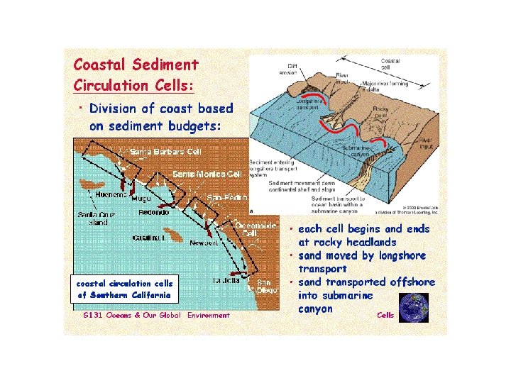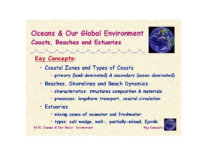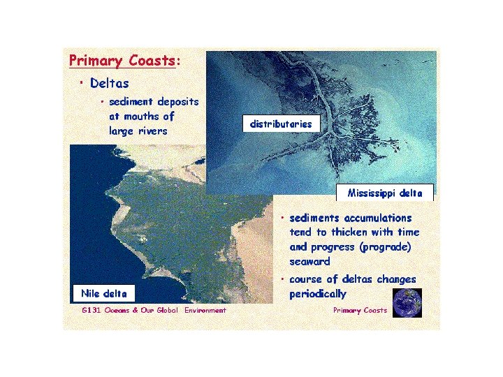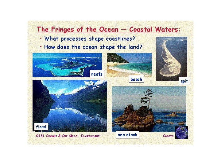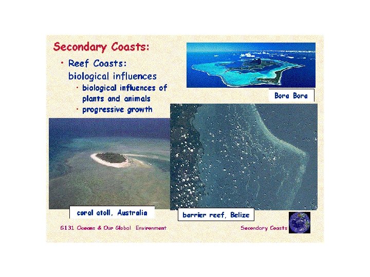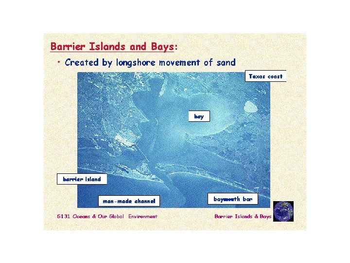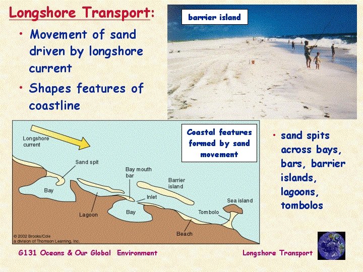 Sandy coastalines • At shallow coast, breaking storm waves may carry sand toward shore and deposit it just offshore as a barrier island. • Alternatively, if a longshore current veers out to sea, it slows down and deposits sand where it reaches deeper water. • Other mechanisms involve sea-level change. • Sand dunes or beaches may form barrier islands if a coastline sinks.