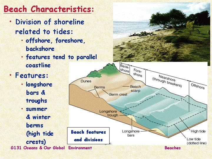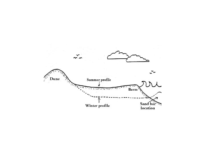Beach profile • The beach is the strip of the shoreline that is washed by waves and tides. • It is divided into two zones: • The foreshore, called the intertidal zone that lies between the high and low tide lines. • The backshore is usually dry but is washed by waves during storms. • The berm is a higher point on the beach separating the backshoreforeshore boundary.