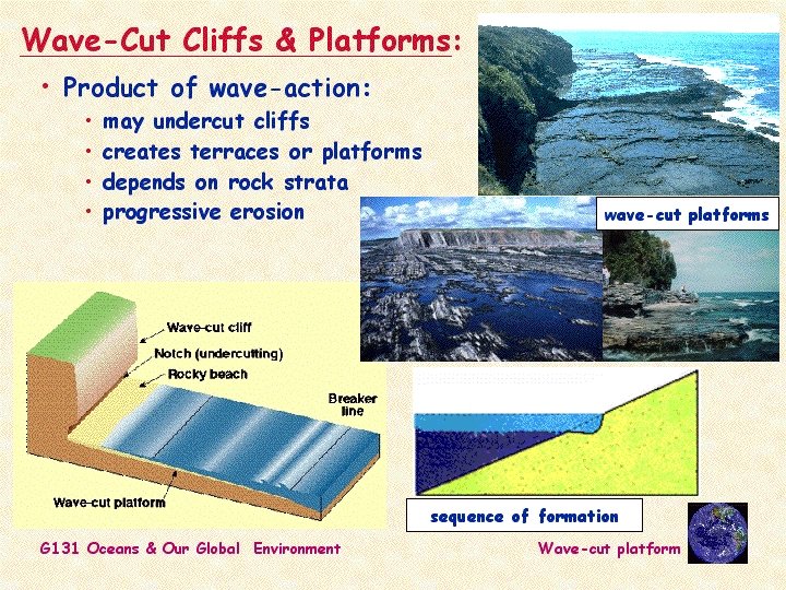 Rocky coastalines • A wave-cut cliff forms when waves erode a rocky headland into a steep profile. • As the cliff erodes, it leaves a flat or gently sloping wave-cut platform.