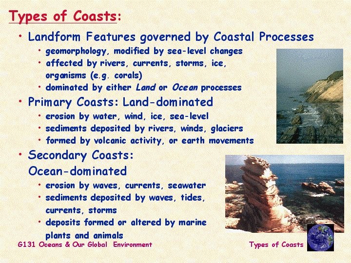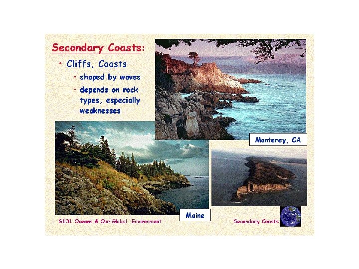 Rocky coastalines • Submergent coastlines are commonly sediment poor and are characterized by steep, rocky shores. • Irregular coastaline with many bays and headlands.