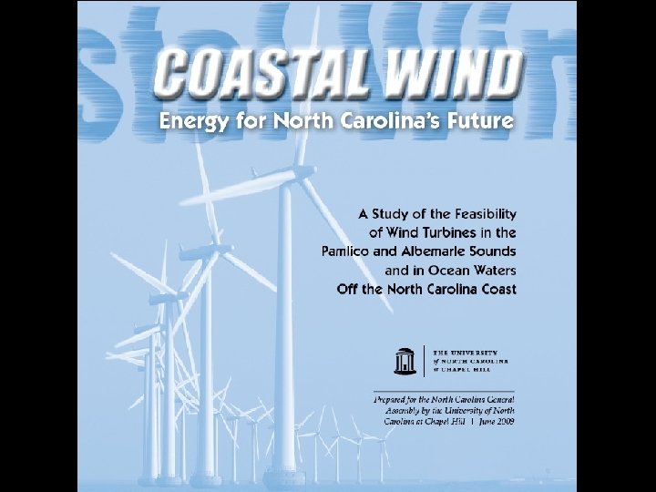 Coastal Wind Energy Study Components Wind resource evaluation Ecological impacts, synergies, use conflicts Foundation concepts Geologic framework Utility transmission infrastructure Utility-related statutory and regulatory barriers Legal framework, issues, and policy concerns Carbon reduction Preliminary economic analysis Presentation includes summaries of some components.