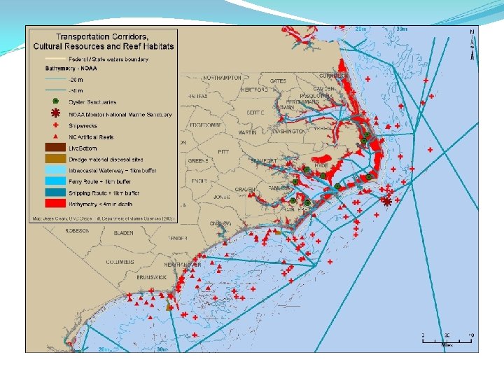 Navigation Corridors, Cultural Resources, Reef Habitats All marked navigation channels (ferries, shipping, intercoastal waterway), 1 km buffer on each side Shipwrecks, including Monitor National Marine Sanctuary Artificial reefs, live bottom and oyster sanctuaries Dumping sites