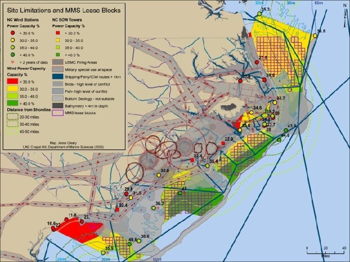 Synthesis Results Limited portion of State waters, restricted to the eastern half of Pamlico Sound, appears feasible for further study Large areas offshore are potentially well-suited for wind energy development. More than 2800 square miles of potential development area in waters less than 50 m deep and within 50 miles of the coastline Raleigh and Onslow Bay appear to have the most promising wind resource, with capacity factors exceeding 40% in water depths greater than 30 m Winds over the shelf north of Cape Hatteras do not appear as favorable as those to the south but it is important to note that there are no direct measurements of winds on the northern shelf in water depths less than 45 m 190 federal MMS lease blocks do not intersect with any constraint and have wind power capacity estimated in excess of 35%.