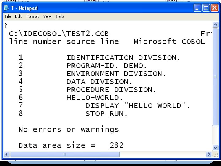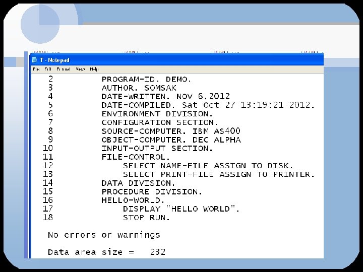 Margin Rules • All other statements, clauses, and sentences begin anywhere in Area B (column 12, 13, 14, etc. ) – Select entries in ENVIRONMENT DIVISION – Data description entries in DATA DIVISION – All PROCEDURE DIVISION instructions 2 -20