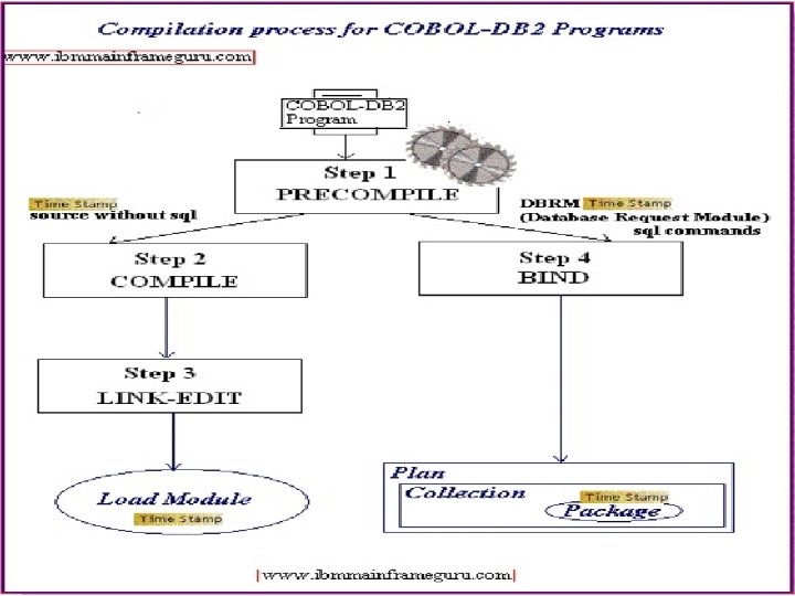 Precompile § Searches all the SQL statements and include members and comments out every SQL statements in the program § The SQL statement are replaced by a call statement along with the parameters § § All SQL statements are extracted and put in a DBRM § It also assign a time stamp to the modified code and DBRM member. Both SQLCA & DCLGEN copybooks are expanded in the pre compile process only.
