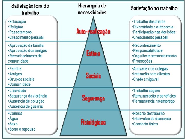 Teoria dos Dois Fatores Não-satisfação Insatisfação FATORES MOTIVACIONAIS Satisfação + FATORES HIGIÊNICOS Fatores Extrínsecos Relacionados ao ambiente do trabalho Políticas e administração da empresa. Supervisão. Condições de trabalho. Relações interpessoais. Salário, status e segurança. Não-satisfação FATORES MOTIVACIONAIS Fatores Intrínsecos Relacionados ao trabalho em si Conquistas. Reconhecimento. Trabalho em si. Responsabilidade. Crescimento profissional.