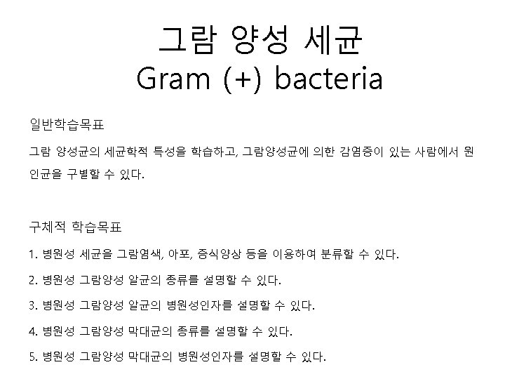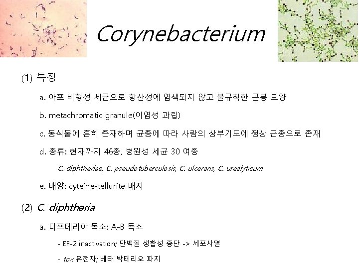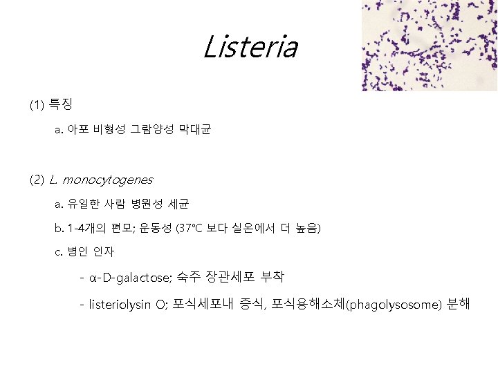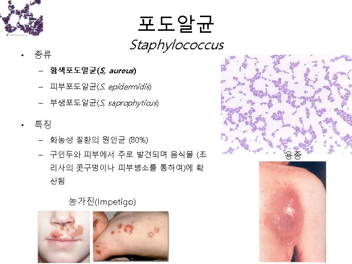 구조적 특징 • Capsule: Antiphagocytic effect를 나타낸다. • Teichoic acid: Bacteriophage에 대한 receptor역할과 mucosal surface receptor에 결합하는 부위. • Protein A: Peptidoglycan layer에 연관되어 있으며, secretion 되기도 한다. Ig. G 1, Ig. G 2, Ig. G 4의 Fc receptor로 작용하며, antiphagocytic effect를 나타낸다. • Peptidoglycan: Penicillin계에 감수성