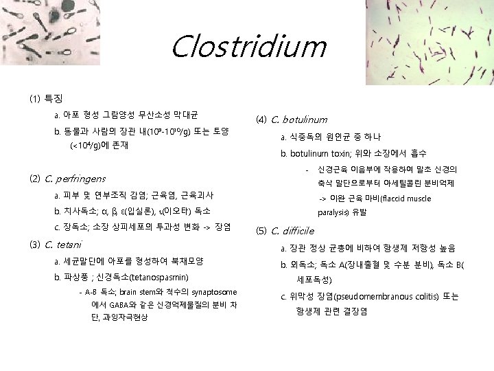 독소 Cytotoxin: 용혈 유발 Exfoliative toxin: 4 S syndrome (Staphylococcal Scalded Skin Syndrome) Toxic shock syndrome Toxin - 1 (TSST - 1) Enterotoxin A, B, C, D, E type A: 식중독과 관련 type B: Staphylococcal pseudomembranous enterocolitis Exfoliative toxin (Epidermolytic toxin)