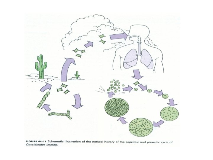 Desert soil, pottery, archaeological middens, cotton, and rodent burrows all harbor C. immitis is a dimorphic fungus with 2 life cycles. The organism follows the SAPROPHYTIC cycle in the soil and the PARASITIC cycle in man or animals
