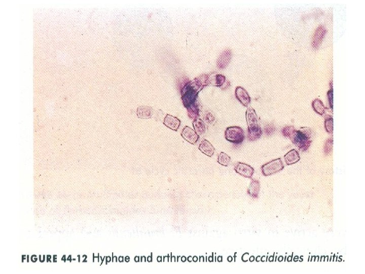 Clinical Specimens Clinical specimens include sputum, pus from skin lesions, gastric washings, CSF, and biopsy material from skin lesions. Mycology C. immitis is a dimorphic fungus. Cultured on SDA at 25 ºC it grows as a mold in 2 to 3 weeks. Characteristically, the mycelia develop arthroconidia. ("By their fruits ye shall know them"). It is a barrelshaped (smaller at the edges, wider at the middle) asexual spore. Typically, the arthroconidia alternate with non spore-forming cells in the mycelium. When grown in vitro at 37º C, there is no yeast form!! C. immitis is a dimorphic fungus; in vivo, (pus or tissue) one sees the pathogenic or invasive form which is a spherule. The organism develops into spherules (30 -60 µ) that are filled with endospores which are 3 to 5 microns in diameter. A spherule will develop endospores within, then break apart, releasing the endospores. This is the tissue form seen in pus or histological sections: spherules and loose endospores. They can also be seen in a KOH preparation of sputum. It is pathognomonic for coccidioidomycosis.