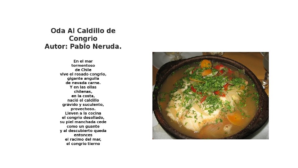 Pescados y mariscos • Es típico el pescado frito (puede ser congrio, corvina o merluza) acompañado de papas o ensalada. • Jaiba, machas, choritos, locos, almejas, etc