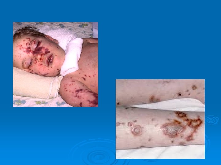 Infecciones por MGC Ø Síntomas: fiebre alta, escalofríos, dolor muscular y rash petequial (típico de infecciones por MGC) Ø Enfermedad puede ser crónica, moderada o fulminante. l l Tipo fulminante: Síndrome de W-F con CID, hemorragia dentro de la piel, glándulas adrenales y otros órganos. Muerte rápida por la toxemia generalizada y el shock.