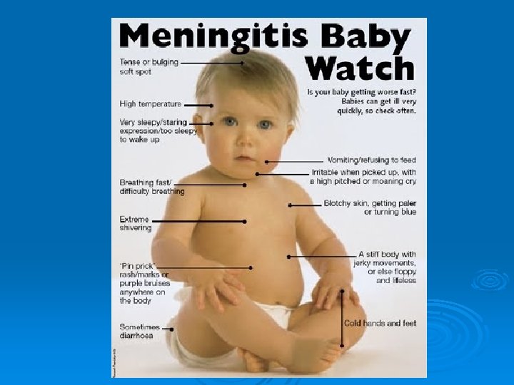Enfermedades asociadas con Neisseria meningitidis ØDespués de la diseminación de organismos virulentos de la nasofaringe: ü Meningitis ü Septicemia (meningococcemia) con o sin meningitis ü Meningoencefalitis ü Neumonia ü Artritis ü Uretritis