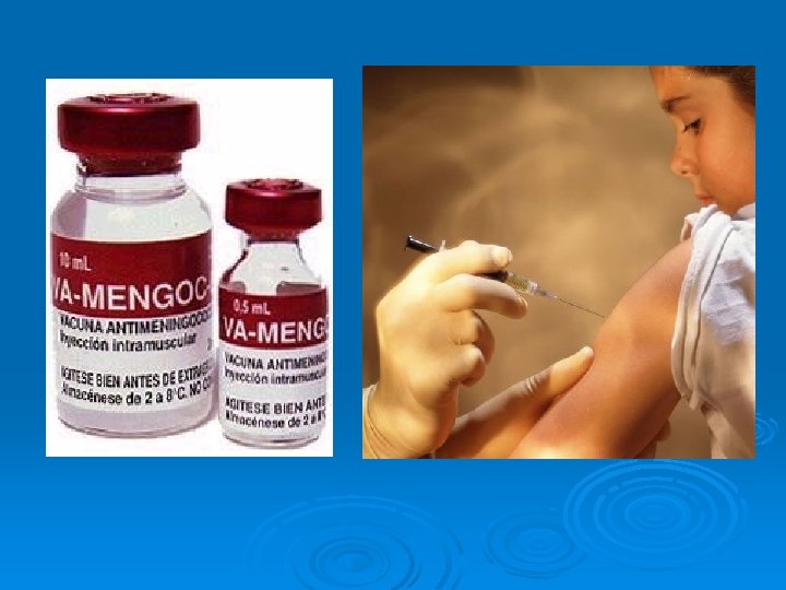 Prevención y Tratamiento • Vacunas de polisacárido conjugado para niños menores de 2 años (18 meses). • Serogrupos A, C, Y y W-135 • No se muy inmunogénica ni confiere inmunidad prolongada l Vacuna conjugada con el toxoide diftérico • Autorizada para 11 -55 años