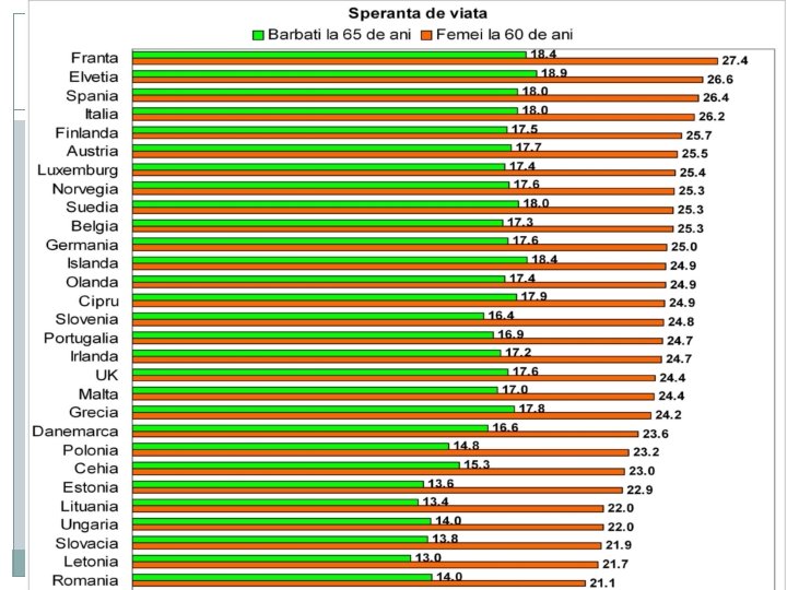 Speranţa de viaţă la naştere este şi ea una dintre cele mai mici din Uniunea Europeană. Cetăţenii români trăiesc mai puţin decât cetăţenii europeni (bărbaţii în medie 69, 8 ani, cu 6, 5 ani mai puţin decât media UE, iar femeile 77, 4 ani, cu 5 ani mai puţin decât media UE).