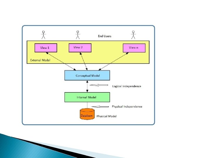 RULE 8 : LOGICAL DATA INDEPENDENCE RULE What is independence? The ability to modify schema definition in on level without affecting schema definition in the next higher level is called data independence � The ability to change the logical (conceptual) schema without changing the External schema (User View) is called logical data independence. � EXAMPLE: The addition or removal of new entities, attributes, or relationships to the conceptual schema should be possible without having to change existing external schemas or having to rewrite existing application programs. �