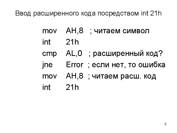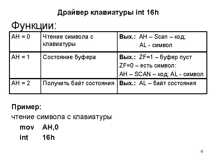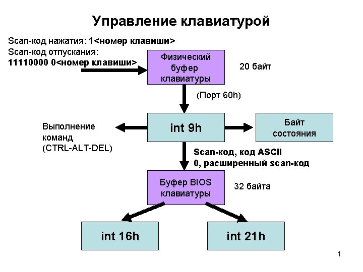 Программирование порта клавиатуры Code int_9 h segment assume CS: Code proc far push AX in AL, 60 h push AX in AL, 61 h mov AH, AL or AL, 80 h out 61 h, AL mov AL, AH out 61 h, AL pop AX <обработка> mov AL, 20 h out 20 h, AL pop AX iret. . . Первый разряд порта 61 h 1 t 0 2
