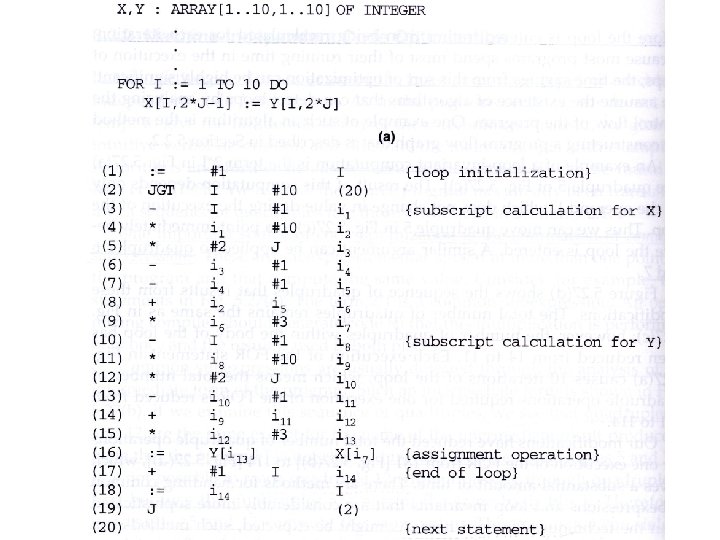 Code Optimization • Some optimization can be obtained by rewriting the source program, e. g. , T 1 : = 2 * J; T 2 : = T 1 – 1; FOR I : = 1 TO 10 DO X[I, T 2] : = Y[I, T 1] • However, this would achieve only a part of the benefits of code optimization. • An optimizing compiler should allow the programmer to write source code that is clear and easy to read, and it should compile such a program into machine code that is efficient to execute.