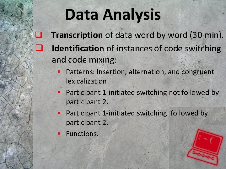 Data Analysis q Transcription of data word by word (30 min). q Identification of instances of code switching and code mixing: § Patterns: Insertion, alternation, and congruent lexicalization. § Participant 1 -initiated switching not followed by participant 2. § Participant 1 -initiated switching followed by participant 2. § Functions.