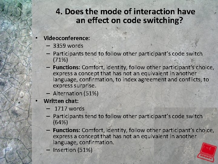 4. Does the mode of interaction have an effect on code switching? • Videoconference: – 3359 words – Participants tend to follow other participant’s code switch (71%) – Functions: Comfort, identity, follow other participant’s choice, express a concept that has not an equivalent in another language, confirmation, to index agreement and conflicts, to express surprise. – Alternation (51%) • Written chat: – 1717 words – Participants tend to follow other participant’s code switch (64%) – Functions: Comfort, identity, follow other participant’s choice, express a concept that has not an equivalent in another language, confirmation. – Insertion (51%)