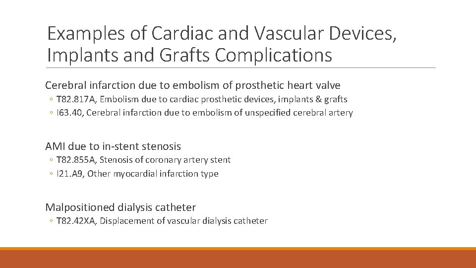 Examples of Cardiac and Vascular Devices, Implants and Grafts Complications Cerebral infarction due to embolism of prosthetic heart valve ◦ T 82. 817 A, Embolism due to cardiac prosthetic devices, implants & grafts ◦ I 63. 40, Cerebral infarction due to embolism of unspecified cerebral artery AMI due to in-stent stenosis ◦ T 82. 855 A, Stenosis of coronary artery stent ◦ I 21. A 9, Other myocardial infarction type Malpositioned dialysis catheter ◦ T 82. 42 XA, Displacement of vascular dialysis catheter